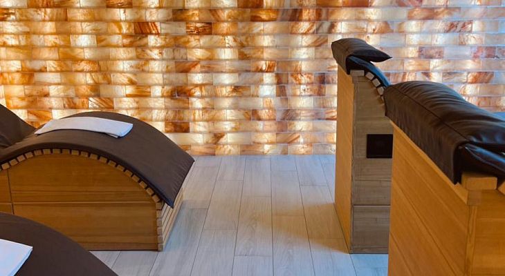 Галосауна Verba Galo не только полезная, но и очень красивая. Стены выложены из блоков натуральной розовой гималайской соли и уютно подсвечиваются изнутри. Волшебная атмосфера соляной пещеры и панорама соснового леса в окнах способствуют расслаблению и глубокому, качественному отдыху нервной системы.